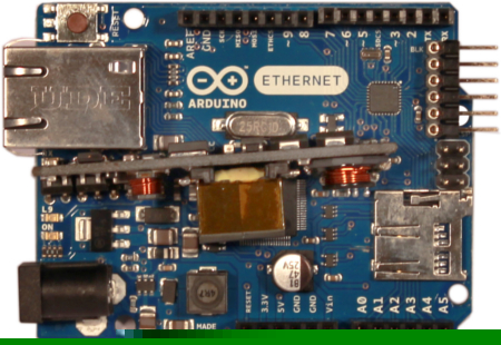 The Arduino Ethernet is a microcontroller board based on the ATmega328 (datasheet). It has 14 digital input/output pins, 6 analog inputs, a 16 MHz crystal oscillator, a RJ45 connection, a power jack, an ICSP header, and a reset button.