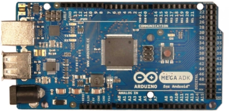 The Arduino ADK is a microcontroller board based on the ATmega2560 (datasheet). It has a USB host interface to connect with Android based phones, based on the MAX3421e IC. It has 54 digital input/output pins (of which 14 can be used as PWM outputs), 16 analog inputs, 4 UARTs (hardware serial ports), a 16 MHz crystal oscillator, a USB connection, a power jack, an ICSP header, and a reset button.